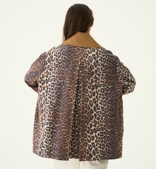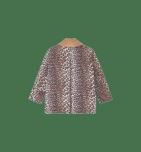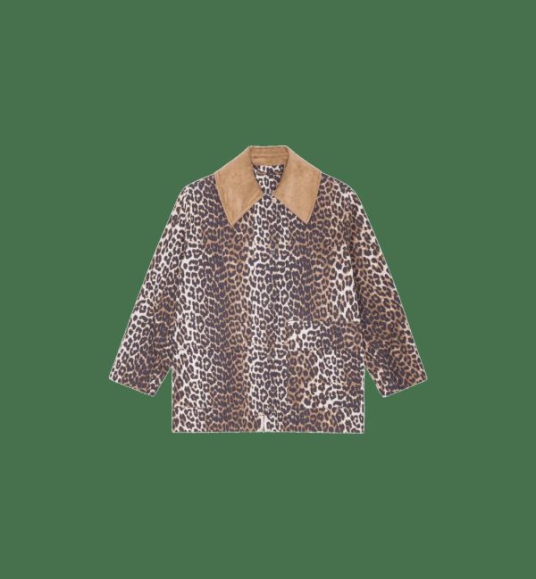 De GANNI Leopard Printed Canvas Midi Jacket heeft een ontspannen, boxy pasvorm en een brede corduroy kraag in een contrasterende camelkleur. Het jack heeft een knoopsluiting aan de voorkant, oversized zakken en recht gesneden mouwen. De perfecte jas voor over je favoriete outfit.
