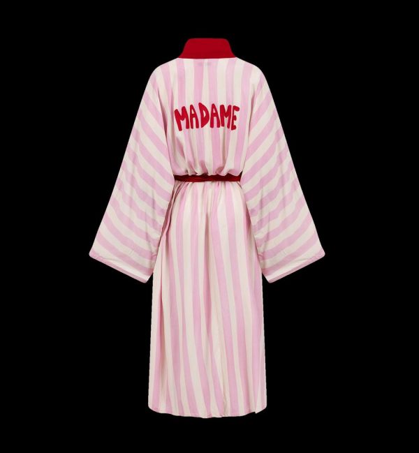 De Madame Long Kimono is jou zomer must-have! De kimono is te combineren met een avondoutfit of draag het casual op het strand als een cover-up; de mogelijkheden zijn eindeloos! De kimono is gemaakt van 100% rayon (kunstzijde) met geborduurde letters op de rug.