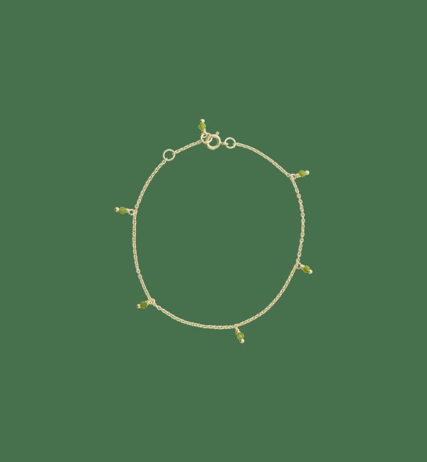 The Nova Sage Bracelet embodies the essence of cosmic beauty. This celestial bracelet is handmade using 100% recycled 14K gold and has Green Tourmaline gemstones hanging from its interlinked chains. Perfect for adding a touch of heavenly charm to any occasion.