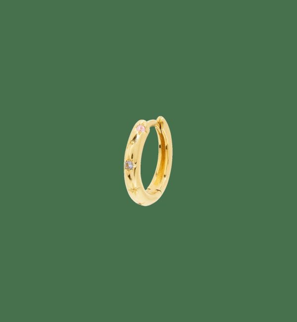 The Single Interstellar Ring Earing 14K is a captivating celestial piece that channels the beauty of the cosmos. This absolute beauty is handmade with precision using only recycled 14K gold. The single-ring earring is set with 3 different gemstones that make this earring the perfect statement piece for those who seek to uncover the mysteries of the universe.
