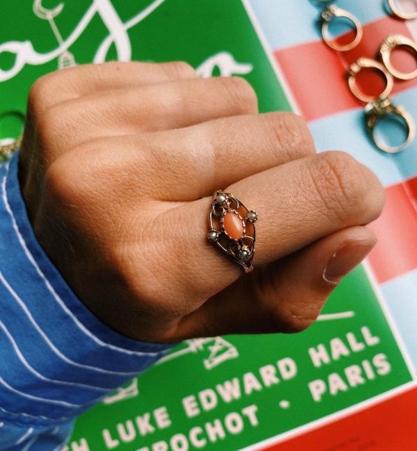 De Vintage Coral Pearl Ring is een prachtig, gedetailleerd item. De ring heeft een sierlijke band met uitgesneden details. In het midden van de ring is een coraal edelsteen ingelegd met daaromheen vier parels. De perfecte toevoeging aan je sieraden collectie.